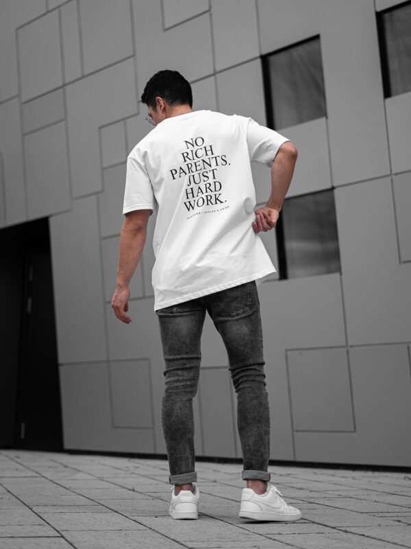 Schwarzer Print „No Rich Parents. Just Hard Work.“ auf dem Rücken.
