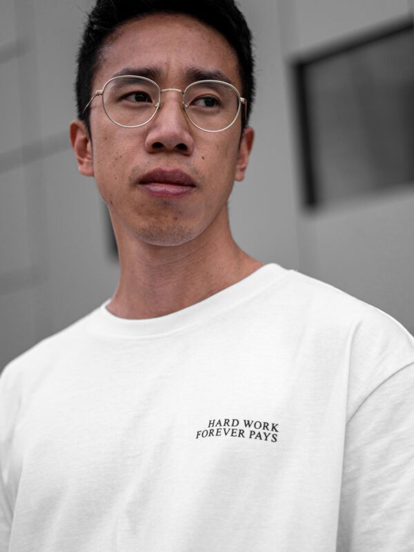 Schwarzer Print „Hard Work Forever Pays“ auf der Front.