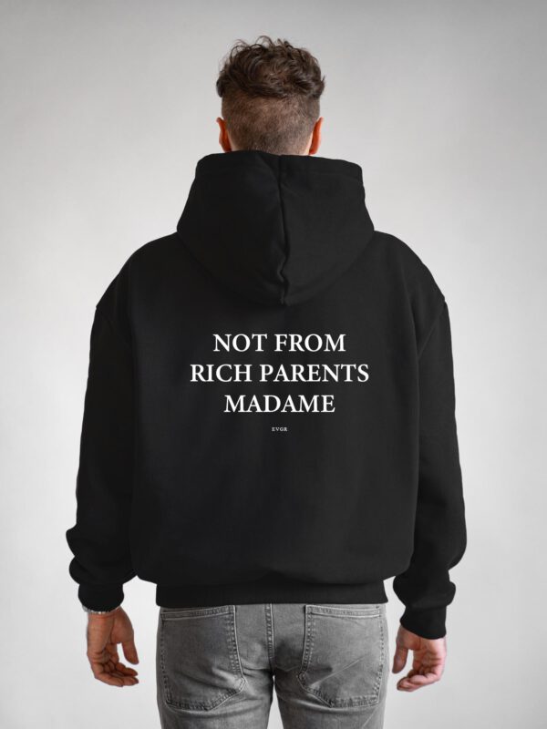 Großer, weißer Print „Not From Rich Parents Madame – E V G R“ auf dem Rücken.