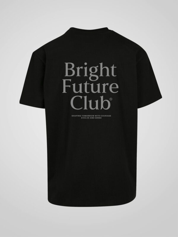 Grauer Print „Bright Future Club – Shaping Tomorrow with Courage – Evolve And Grind“ auf dem Rücken.