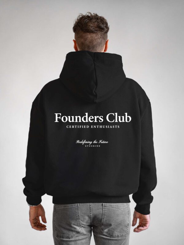 Weißer Print „Founders Club – Certified Enthusiasts – Redefining the Future – Evogrind “ auf dem Rücken.