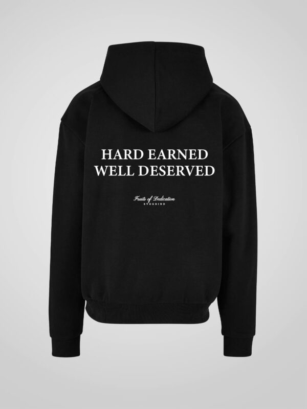 Weißer Print “Hard Earned Well Deserved – Fruits of Dedication – Evogrind” auf dem Rücken.