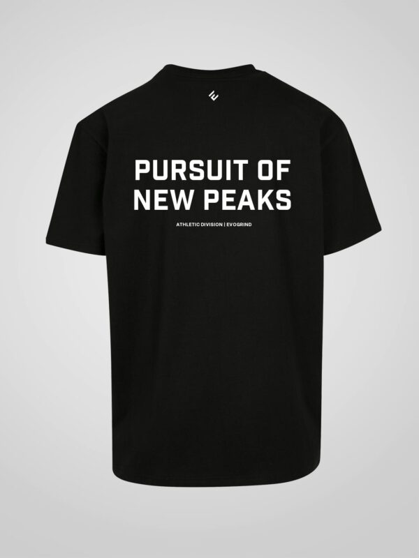 Weißer Print “E Athletic Logo – Pursuit of New Peaks – Athletic Division | Evogrind” auf dem Rücken.