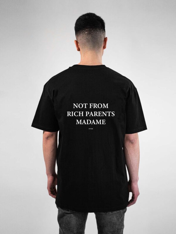 Großer, weißer Print „Not From Rich Parents Madame – E V G R“ auf dem Rücken.