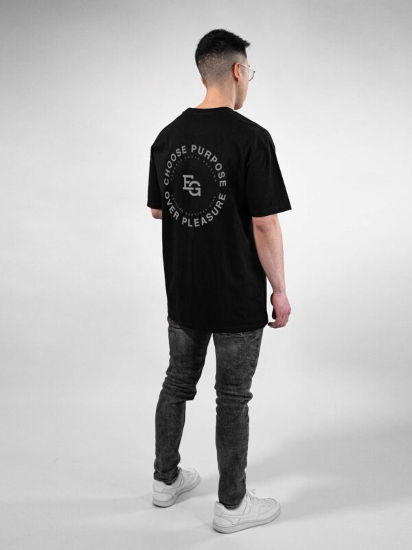 Grauer Print „Choose Purpose over Pleasure – Purpose fuels Passion. Passion elevates Life.“ auf dem Rücken.