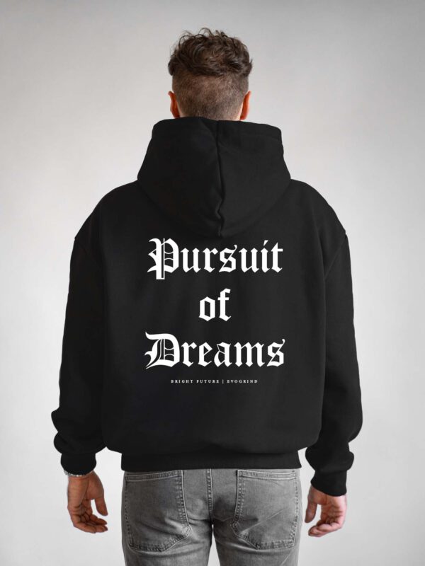 Weißer Print “Pursuit of Dreams – Bright Future | Evogrind” auf dem Rücken.
