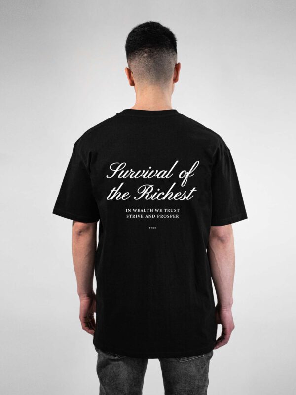 Weißer Print „Survival of the Richest – In Wealth We Trust – Strive and Prosper – EVGR“ auf dem Rücken.