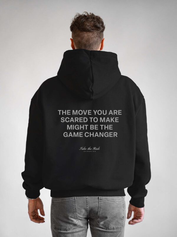Grauer Print „The move you are scared to make might be the game changer – Take the Risk – Evogrind“ auf dem Rücken.